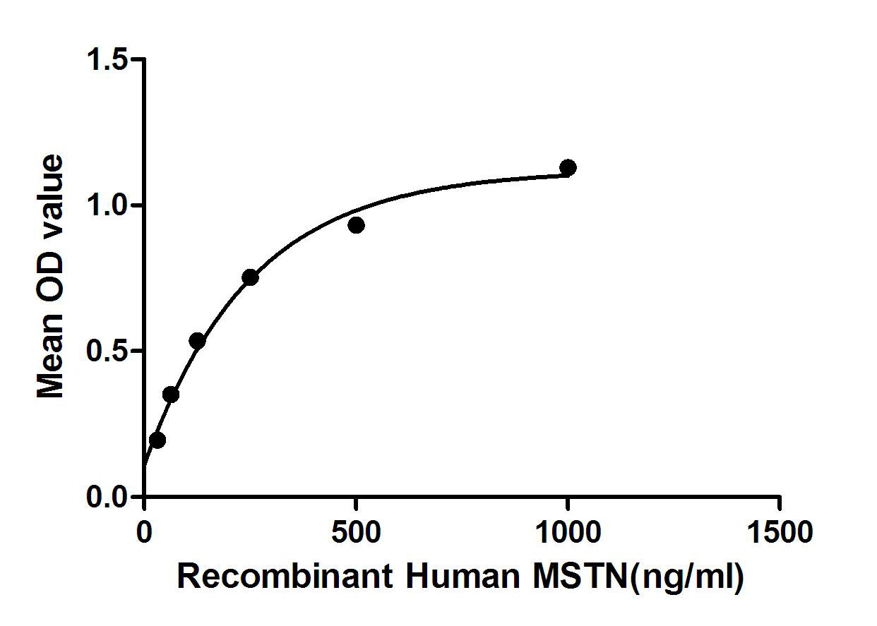 Myostatin (MSTN) also known as growth differentiation factor 8 (GDF-8) is a member of the TGF beta protein family. Myostatin is a secreted growth differentiation factor that produced and released by myocytes. This protein negatively regulates skeletal muscle cell proliferation and differentiation. Besides, Bone Morphogenetic Protein 1 (BMP1) has been identified as an interactor of MSTN, thus a binding ELISA assay was conducted to detect the interaction of recombinant human MSTN and recombinant human BMP1. Briefly, MSTN were diluted serially in PBS, with 0.01% BSA (pH 7.4). Duplicate samples of 100uL were then transferred to BMP1-coated microtiter wells and incubated for 2h at 37℃. Wells were washed with PBST and incubated for 1h with anti-MSTN pAb, then aspirated and washed 3 times. After incubation with HRP labelled secondary antibody, wells were aspirated and washed 3 times. With the addition of substrate solution, wells were incubated 15-25 minutes at 37℃. Finally, add 50µL stop solution to the wells and read at 450nm immediately. The binding activity of MSTN and BMP1 was shown in Figure 1, and this effect was in a dose dependent manner.