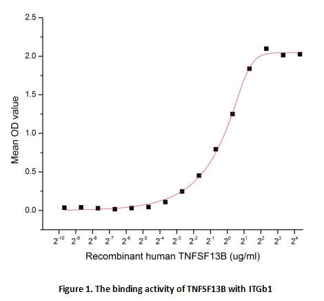 Tumor necrosis factor ligand superfamily member 13B protein (TNFSF13B) also known as B-cell activating factor (BAFF) is a cytokine that belongs to the tumor necrosis factor (TNF) ligand family. This cytokine is a ligand for receptors TNFRSF13B/TACI, TNFRSF17/BCMA, and TNFRSF13C/BAFF-R. This cytokine is expressed in B cell lineage cells, and acts as a potent B cell activator. It has been also shown to play an important role in the proliferation and differentiation of B cells. Besides, Integrin Beta 1 (ITGb1) has been identified as an interactor of TNFSF13B, thus a binding ELISA assay was conducted to detect the interaction of recombinant human TNFSF13B and recombinant human ITGb1. Briefly, TNFSF13B were diluted serially in PBS, with 0.01% BSA (pH 7.4). Duplicate samples of 100ul were then transferred to ITGb1-coated microtiter wells and incubated for 2h at 37℃. Wells were washed with PBST and incubated for 1h with anti-TNFSF13B pAb, then aspirated and washed 3 times. After incubation with HRP labelled secondary antibody, wells were aspirated and washed 3 times. With the addition of substrate solution, wells were incubated 15-25 minutes at 37℃. Finally, add 50µL stop solution to the wells and read at 450nm immediately. The binding activity of TNFSF13B and ITGb1 was shown in Figure 1, the EC50 was 0.74~0.93 ug/ml.