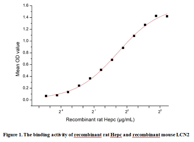 Hepcidin (Hepc) is a regulator of iron metabolism.Hepcidin inhibits iron transport by binding to the iron export channel ferroportin which is located on the basolateral surface of gut enterocytes and the plasma membrane of reticuloendothelial cells (macrophages). Hepcidin ultimately breaks down the transporter protein in the lysosome. Inhibiting ferroportin prevents iron from being exported and the iron is sequestered in the cells. Besides, Lipocalin-2 (LCN2) has been identified as an interactor of Hepc, thus a functional binding ELISA assay was conducted to detect the interaction of recombinant rat Hepc and recombinant mouse LCN2. Briefly, Hepc was diluted serially in PBS with 0.01% BSA (pH 7.4). Duplicate samples of 100 μl were then transferred to LCN2-coated microtiter wells and incubated for 1h at 37℃. Wells were washed with PBST and incubated for 1h with anti-Hepc pAb, then aspirated and washed 3 times. After incubation with HRP labelled secondary antibody for 1h at 37℃, wells were aspirated and washed 5 times. With the addition of substrate solution, wells were incubated 15-25 minutes at 37℃. Finally, add 50 µL stop solution to the wells and read at 450/630nm immediately. The binding activity of recombinant rat Hepc and recombinant mouse LCN2 was shown in Figure 1, the EC50 for this effect is 2.267µg/mL.