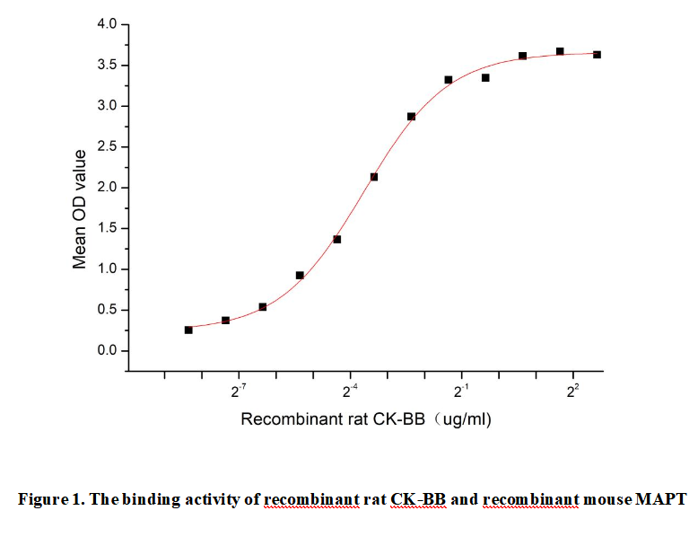 Creatine Kinase B (CK-BB) is a brain-enriched isoform of creatine kinase that plays a critical role in maintaining cellular energy homeostasis by catalyzing the reversible transfer of phosphate between ATP and phosphocreatine. It is highly expressed in neurons and smooth muscle, and its elevated levels in cerebrospinal fluid or blood serve as a biomarker for brain injury and neurodegenerative disorders. CK-BB interacts with Tau protein (MAPT), potentially influencing Tau phosphorylation and aggregation, which may contribute to impaired energy metabolism in tauopathies like Alzheimer’s disease.Thus a functional ELISA assay was conducted to detect the interaction of recombinant rat CK-BB and recombinant mouse MAPT. Briefly, CK-BB was diluted serially in PBS with 0.01% BSA (pH 7.4). Duplicate samples of 100 μl were then transferred to MAPT-coated microtiter wells and incubated for 1h at 37℃. Wells were washed with PBST and incubated for 1h with anti-CK-BB pAb, then aspirated and washed 3 times. After incubation with HRP labelled secondary antibody for 1h at 37℃, wells were aspirated and washed 5 times. With the addition of substrate solution, wells were incubated 15-25 minutes at 37℃. Finally, add 50 µL stop solution to the wells and read at 450/630nm immediately. The binding activity of recombinant rat CK-BB and recombinant mouse MAPT was shown in Figure 1, the EC50 for this effect is 0.08 μg/mL.