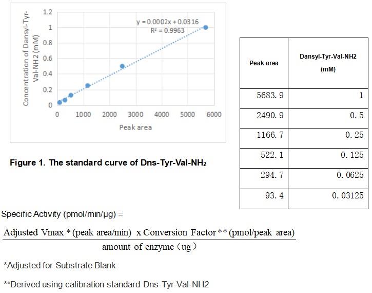Peptidyl-glycine alpha-amidating monooxygenase(PAM) is an enzyme that is required for the biosynthesis of many signaling peptides. It has two enzymatically active domains with catalytic activities - peptidylglycine alpha-hydroxylating monooxygenase (PHM) and peptidyl-alpha-hydroxyglycine alpha-amidating lyase (PAL). These catalytic domains work sequentially to catalyze neuroendocrine peptides to active alpha-amidated products. A typical activity assay using Dns-Tyr-Val-Gly as substrate, thus the recombinant rat PAM activity was measured by its ability to hydrolyze Dns-Tyr-Val-Gly to Dns-Tyr-Val-NH2. The reaction was performed in 1ml containing 100mM MES/KOH pH 6.0, 30mM KI, 30mM KCl, 1μmol/L cupric sulfate, 100ug/ml catalase, 1% (v/v) ethanol,0.001% (v/v) Triton X-100, 10mM ascorbate ,0.35mM/L Dns-Tyr-Val-Gly(0.2mg/ml) and initiated by addition various concentrations of PAM(0.1ug/ml,1ug/ml,5ug/ml). Incubated at 37℃ for 30min, the reaction stopped by addition 6% (v/v)TCA . The product and substrate was detected by RP-HPLC with UV-detection at 280nm, the analyses were performed at 25℃ employing a Agilent ZORBAX Poroshell SB C18 column(9.4×250mm,5μm), the flow rate was 1ml/min. The mobile phase consisited of 100 mM sodium acetate (pH 6.5) and 35min linear gradient of 10-90% acetonitrile. The result was shown in Figure 1. As the Figure 1 shows, after 30min later, the substrate have been hydrolyzed when the PAM was 5 ug/ml. The retention time of Dns-Tyr-Val-Gly and Dns-Tyr-Val-NH2 is 24.315 and 30.806 respectively. The specific activity of recombinant rat PAM is > 7600 pmol/min/µg.