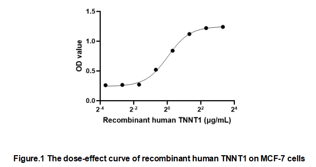 Troponin T Type 1, Slow Skeletal (TNNT1) is a regulatory complex located on the thin filament of the sarcomere. TNNT1 plays a crucial role in the regulation of muscle contraction, specifically in slow-twitch skeletal muscle fibers. As a key component of the troponin complex, which also includes troponin I and troponin C, TNNT1 interacts with actin, tropomyosin, and calcium ions to modulate the contraction-relaxation cycle of muscle tissue. Previous research has indicated that TNNT1 can promote cell proliferation.To test the effect of TNNT1 on cell proliferation, MCF-7 cells were seeded into triplicate wells of 96-well plates and allowed to attach, replaced with various concentrations of recombinant humanTNNT1. After incubated for 72h, cells were observed by inverted microscope and cell proliferation was measured by Cell Counting Kit-8 (CCK-8). Briefly, 10 µl of CCK-8 solution was added to each well of the plate, then the absorbance at 450 nm was measured using a microplate reader after incubating the plate for 1-4 hours at 37 ℃. Cell viability was assessed by CCK-8 assay after incubation with recombinant human TNNT1 for 72h. The result was shown in Figure 1. It was obvious that TNNT1 significantly increased cell viability of MCF-7 cells. The ED50 of recombinant humanTNNT1 is 1.034 μg/ml.