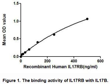 IL17RB (Interleukin-17 receptor B) is a receptor for the proinflammatory cytokines IL17B (Interleukin-17B) and IL17E (Interleukin-17E). This receptor has been shown to mediate the activation of NF-kappaB and the production of IL8 induced by IL17E. Thus a binding ELISA assay was constructed to detect the association of recombinant human IL17RB with recombinant human IL17B. Briefly, IL17RB were diluted serially in PBS, with 0.01%BSA (pH 7.4). Duplicate samples of 100uL were then transferred to IL17B-coated microtiter wells and incubated for 2h at 37°C. Wells were washed with PBST and incubated for 1h with anti-IL17RB pAb, then aspirated and washed 3 times. After incubation with HRP labelled secondary antibody, wells were aspirated and washed 3 times. With the addition of substrate solution, wells were incubated 15-25 minutes at 37°C. Finally, add 50µL stop solution to the wells and read at 450nm immediately. The binding activity of IL17RB with IL17B was shown in Figure 1 and this effect was in a dose dependent manner.