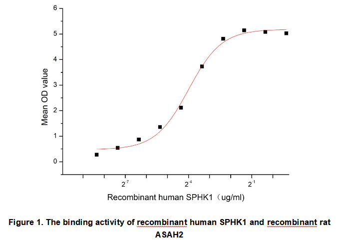 Sphingosine Kinase 1 (SPHK1) is a lipid kinase that catalyzes the phosphorylation of sphingosine to generate sphingosine-1-phosphate (S1P), a potent bioactive lipid mediator regulating cell proliferation, survival, and immune responses. SPHK1 is localized in the cytosol and translocates to the plasma membrane upon activation, playing critical roles in inflammation, cancer progression, and vascular biology. Its overexpression is associated with various cancers and inflammatory diseases.Besides,N-Acylsphingosine Amidohydrolase 2 (ASAH2) has been identified as an interactor of SPHK1, thus a functional binding ELISA assay was conducted to detect the interaction of recombinant human SPHK1 and recombinant rat ASAH2. Briefly, SPHK1 was diluted serially in PBS with 0.01% BSA (pH 7.4). Duplicate samples of 100 μl were then transferred to ASAH2-coated microtiter wells and incubated for 1h at 37℃. Wells were washed with PBST and incubated for 1h with anti-SPHK1 pAb, then aspirated and washed 3 times. After incubation with HRP labelled secondary antibody for 1h at 37℃, wells were aspirated and washed 5 times. With the addition of substrate solution, wells were incubated 15-25 minutes at 37℃. Finally, add 50 µL stop solution to the wells and read at 450/630nm immediately. The binding activity of recombinant human SPHK1 and recombinant rat ASAH2 was shown in Figure 1, the EC50 for this effect is 0.06 μg/mL.
