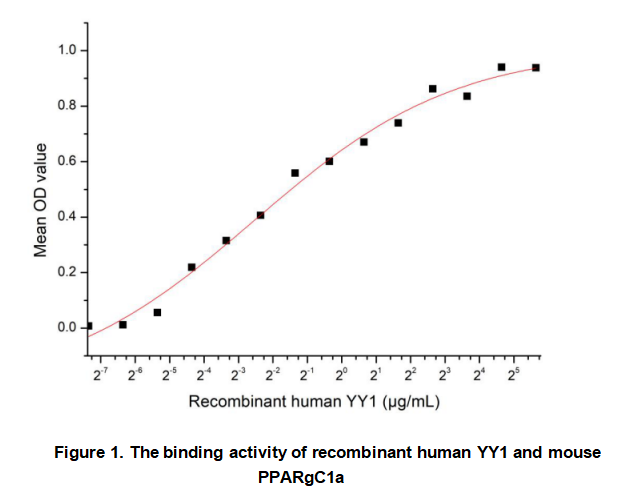 YY1 Transcription Factor (YY1), a 414-amino-acid zinc-finger protein encoded by the YY1 gene, is a multifunctional transcription regulator widely expressed in eukaryotic cells. It exerts dual roles in gene expression, acting as either an activator or repressor depending on the cellular context, binding partners, and target gene promoters. YY1 participates in diverse biological processes, including embryonic development, cell proliferation, differentiation, apoptosis, and tumorigenesis. Its zinc-finger domain mediates specific DNA binding, while its N-terminal and C-terminal regions interact with various cofactors to modulate transcriptional activity. Dysregulation of YY1 is closely linked to multiple cancers, cardiovascular diseases, and neurological disorders due to its impact Reshaping gene expression profiles. YY1 interacts with PPARgC1a to co-regulate mitochondrial biogenesis and energy metabolism-related gene transcription.Thus a functional ELISA assay was conducted to detect the interaction of recombinant human YY1 and recombinant mouse PPARgC1a. Briefly, YY1 was diluted serially in PBS with 0.01% BSA (pH 7.4). Duplicate samples of 100 μl were then transferred to PPARgC1a-coated microtiter wells and incubated for 1h at 37℃. Wells were washed with PBST and incubated for 1h with anti-YY1 pAb, then aspirated and washed 3 times. After incubation with HRP labelled secondary antibody for 1h at 37℃, wells were aspirated and washed 5 times. With the addition of substrate solution, wells were incubated 15-25 minutes at 37℃. Finally, add 50 µL stop solution to the wells and read at 450/630nm immediately. The binding activity of recombinant human YY1 and recombinant mouse PPARgC1a was shown in Figure 1, the EC50 for this effect is 0.173µg/mL..