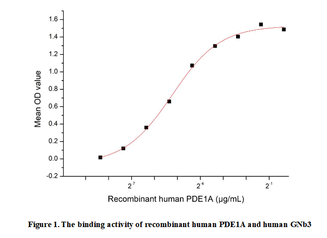 Besides,G Protein Beta 3 (GNb3) has been identified as an interactor of PDE1A, thus a functional binding ELISA assay was conducted to detect the interaction of recombinant human PDE1A and recombinant human GNb3. Briefly, PDE1A was diluted serially in PBS with 0.01% BSA (pH 7.4). Duplicate samples of 100 μl were then transferred to GNb3-coated microtiter wells and incubated for 1h at 37℃. Wells were washed with PBST and incubated for 1h with anti-PDE1A pAb, then aspirated and washed 3 times. After incubation with HRP labelled secondary antibody for 1h at 37℃, wells were aspirated and washed 5 times. With the addition of substrate solution, wells were incubated 15-25 minutes at 37℃. Finally, add 50 µL stop solution to the wells and read at 450/630nm immediately. The binding activity of recombinant rat PDE1A and recombinant human GNb3 was shown in Figure 1, the EC50 for this effect is 0.027µg/mL.