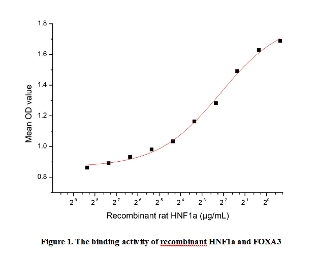 Hepatocyte Nuclear Factor 1 Alpha (HNF1a), encoded by the HNF1A gene, is a key transcription factor predominantly expressed in the liver, pancreas, and kidney. It regulates the expression of numerous genes involved in glucose and lipid metabolism, epithelial cell differentiation, and organ homeostasis. Mutations in HNF1A are closely linked to maturity-onset diabetes of the young type 3 (MODY3), a monogenic form of diabetes. HNF1a interacts with FOXA3, a pioneer transcription factor, to synergistically enhance the transcription of target genes related to metabolic processes.Thus a functional ELISA assay was conducted to detect the interaction of recombinant rat HNF1a and recombinant human FOXA3. Briefly, HNF1a was diluted serially in PBS with 0.01% BSA (pH 7.4). Duplicate samples of 100 μl were then transferred to FOXA3-coated microtiter wells and incubated for 1h at 37℃. Wells were washed with PBST and incubated for 1h with anti-HNF1a pAb, then aspirated and washed 3 times. After incubation with HRP labelled secondary antibody for 1h at 37℃, wells were aspirated and washed 5 times. With the addition of substrate solution, wells were incubated 15-25 minutes at 37℃. Finally, add 50 µL stop solution to the wells and read at 450/630nm immediately. The binding activity of recombinant rat HNF1a and recombinant human FOXA3 was shown in Figure 1, the EC50 for this effect is 0.2245µg/mL.
