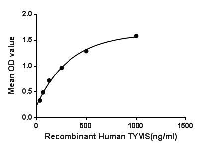 Thymidylate synthetase (TYMS) is an enzyme that catalyzes the conversion of deoxyuridine monophosphate (dUMP) to deoxythymidine monophosphate (dTMP). The enzyme is essential for regulating the balanced supply of the 4 DNA precursors in normal DNA replication: defects in the enzyme activity affecting the regulation process cause various biological and genetic abnormalities. Thymidylate synthase is an enzyme of about 30 to 35kDa in most species except in protozoan and plants where it exists as a bifunctional enzyme that includes a dihydrofolate reductase domain. Besides, Aspartate Aminotransferase (AST) has been identified as an interactor of TYMS, thus a binding ELISA assay was conducted to detect the interaction of recombinant human TYMS and recombinant human AST. Briefly, TYMS were diluted serially in PBS with 0.01% BSA (pH 7.4). Duplicate samples of 100uL were then transferred to AST-coated microtiter wells and incubated for 2h at 37℃. Wells were washed with PBST and incubated for 1h with anti-TYMS pAb, then aspirated and washed 3 times. After incubation with HRP labelled secondary antibody, wells were aspirated and washed 3 times. With the addition of substrate solution, wells were incubated 15-25 minutes at 37℃. Finally, add 50µL stop solution to the wells and read at 450nm immediately. The binding activity of TYMS and AST was shown in Figure 1, and this effect was in a dose dependent manner.