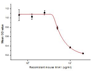 To test the effect of MIA1 on cell apoptosis, A375 cells were seeded into triplicate wells of 96-well plates at a density of 4,000 cells/well and allowed to attach overnight, then the medium was replaced with various concentrations of recombinant mouse MIA1 diluted with 5% serum standard DMEM. After incubated for 48h, cells were observed by inverted microscope and cell viability was measured by Cell Counting Kit-8 (CCK-8). Briefly, 10 µl of CCK-8 solution was added to each well of the plate, then the absorbance at 450 nm was measured using a microplate reader after incubating the plate for 1-4 hours at 37 ℃. Apoptosis of A375 cells after incubation with MIA1 for 48h observed by inverted microscope was shown in Figure 1. The result of cell viability assessed by CCK-8 was shown in Figure 2. It was obvious that MIA1 significantly decreased cell viability of A375 cells. The ED50 of recombinant mouse MIA1 is 5.94 ug/ml.