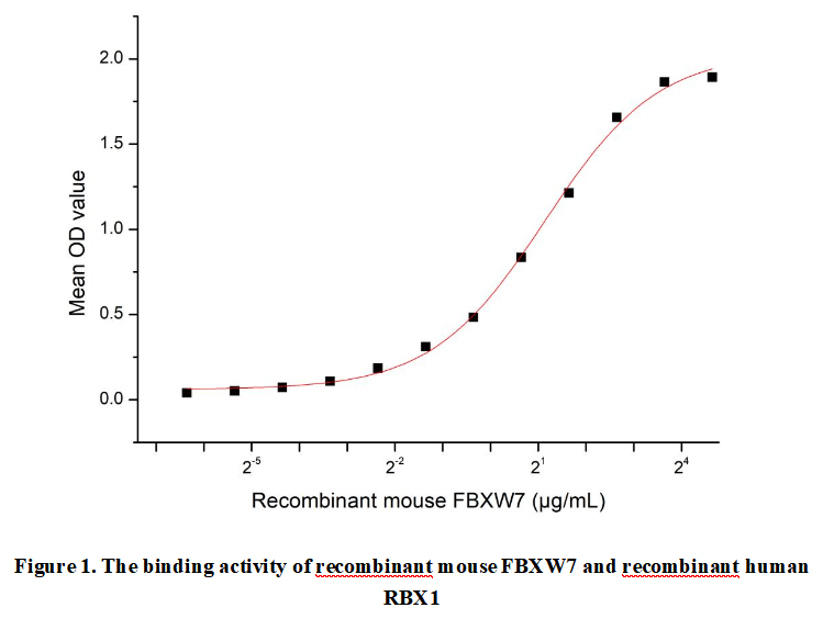 F-Box And WD Repeat Domain Containing Protein 7 (FBXW7), also known as FBW7 or CDC4, serves as a crucial component of the SCF E3 ubiquitin ligase complex. This tumor suppressor protein plays a pivotal role in maintaining cellular homeostasis by targeting several key oncoproteins for degradation. Through its ubiquitin ligase activity, FBXW7 regulates the stability of critical cell cycle regulators and signaling molecules including c-Myc, Cyclin E, Notch, and mTOR. The protein exists in three distinct isoforms that differ in their subcellular distribution and functional specialization. In human cancers, FBXW7 ranks among the most frequently mutated genes, with its inactivation observed across diverse malignancies such as colorectal carcinoma, T-cell acute lymphoblastic leukemia, and breast cancer. Besides,Ring Box Protein 1 (RBX1) has been identified as an interactor of FBXW7, thus a functional binding ELISA assay was conducted to detect the interaction of recombinant mouse FBXW7 and recombinant human RBX1 . Briefly, biotin-linked FBXW7 were diluted serially in PBS, with 0.01% BSA (pH 7.4). Duplicate samples of 100μl were then transferred to RBX1-coated microtiter wells and incubated for 1h at 37℃. Wells were washed with PBST 3 times and incubation with Streptavidin-HRP for 30min, then wells were aspirated and washed 5 times. With the addition of substrate solution, wells were incubated 15-25 minutes at 37℃. Finally, add 50µl stop solution to the wells and read at 450nm immediately. The binding activity of recombinant mouse FBXW7 and recombinant human RBX1 was shown in Figure 1, the EC50 for this effect is 2.20 µg/mL.
