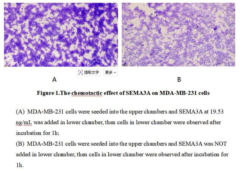 Semaphorin 3A (SEMA3A) is a canonical secreted member of the class 3 semaphorin family, the largest subfamily of the semaphorin superfamily with conserved sema domains. It exerts biological functions primarily by binding to neuropilin-1/plexin-A receptor complexes, acting as a key axon guidance cue in neural development. SEMA3A potently inhibits cell proliferation and migration in multiple cell types including neurons, endothelial and cancer cells; it also induces caspase-dependent apoptosis in tumor cells and suppresses angiogenesis. Additionally, it modulates immune cell trafficking, playing critical roles in neural patterning, tissue morphogenesis and cancer progression.Thus, chemotaxis assay used 24-well microchemotaxis system was undertaken to detect the chemotactic effect of SEMA3A on MDA-MB-231. Briefly, MDA-MB-231 cells were seeded into the upper chambers and SEMA3A at different concentrations was added in lower chamber with a polycarbonate filter(8um pore size) used to separate the two compartments. After incubation at 37℃ with 5% CO2 for 1h, the filter was removed,then cells in low chamber were observed by inverted microscope at low magnification . Result shows that SEMA3A is able to induce migration of MDA-MB-231 cells. The migrated MDA-MB-231 cells in low chamber at low magnification were shown in Figure 1.