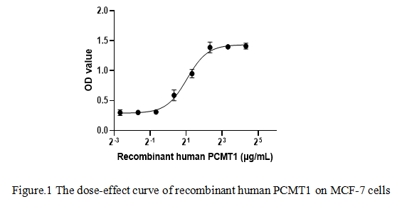 Protein L-Isoaspartate-O-Methyltransferase (PCMT1) is a crucial enzyme involved in the repair of damaged proteins. It catalyzes the methylation of abnormal L-isoaspartyl residues and, to a lesser extent, D-aspartyl residues in proteins, which arise from the spontaneous deamidation and isomerization of asparagine and aspartate residues over time. This post-translational modification serves as a key step in the repair process, allowing these damaged proteins to be either restored to their normal structure or targeted for degradation, thereby maintaining protein homeostasis within cells. As PCMT1 has the function of cell proliferation , we measure the activity of recombinant human PCMT1 by the ability of the protein to stimulate MCF-7 cells proliferation. MCF-7 cells were seeded into triplicate wells of 96-well plates and allowed to attach, replaced with various concentrations of recombinant human PCMT1. After incubated for 72h, cells were observed by inverted microscope and cell proliferation was measured by Cell Counting Kit-8 (CCK-8). Briefly, 10 µl of CCK-8 solution was added to each well of the plate, then the absorbance at 450 nm was measured using a microplate reader after incubating the plate for 1-4 hours at 37 ℃. Cell viability was assessed by CCK-8 assay after incubation with recombinant human PCMT1 for 72h. The result was shown in Figure 1. It was obvious that PCMT1 significantly increased cell viability of MCF-7 cells. The ED50 of recombinant human PCMT1 is 2.059 μg/ml.