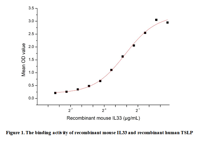 Interleukin 33 (IL33) is a dual-function protein that acts both as a traditional cytokine and an intracellular nuclear factor. It is primarily released by endothelial and epithelial cells upon cellular damage or stress, serving as an "alarmin" to alert the immune system. IL33 signals through its receptor ST2 to drive type 2 immune responses, which are crucial in allergic inflammation, host defense against parasites, and tissue repair.Besides,Thymic Stromal Lymphopoietin (TSLP) has been identified as an interactor of IL33, thus a functional binding ELISA assay was conducted to detect the interaction of recombinant mouse IL33 and recombinant human TSLP. Briefly, IL33 was diluted serially in PBS with 0.01% BSA (pH 7.4). Duplicate samples of 100 μl were then transferred to TSLP-coated microtiter wells and incubated for 1h at 37℃. Wells were washed with PBST and incubated for 1h with anti-IL33 pAb, then aspirated and washed 3 times. After incubation with HRP labelled secondary antibody for 1h at 37℃, wells were aspirated and washed 5 times. With the addition of substrate solution, wells were incubated 15-25 minutes at 37℃. Finally, add 50 µL stop solution to the wells and read at 450/630nm immediately. The binding activity of recombinant mouse IL33 and recombinant human TSLP was shown in Figure 1, the EC50 for this effect is 0.23 µg/mL..