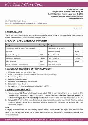 | CEA527Mu | ELISA Kit for Oxidized Low Density Lipoprotein (OxLDL) | Enzyme-linked immunosorbent assay for Antigen Detection. |