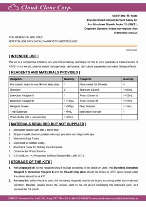 | CEC918Ra | ELISA Kit for Fibroblast Growth Factor 21 (FGF21) | Enzyme-linked immunosorbent assay for Antigen Detection. |