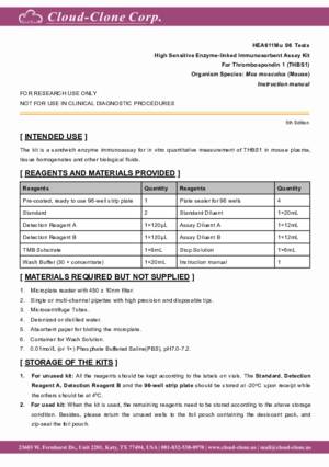 | SEA611Mu | ELISA Kit for Thrombospondin 1 (THBS1) | Enzyme-linked immunosorbent assay for Antigen Detection. |