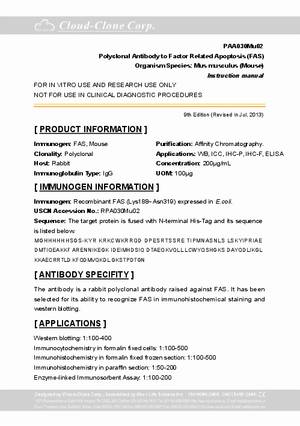 | PAA030Mu01 | Polyclonal Antibody to Factor Related Apoptosis (FAS) | WB; ICC/IF |