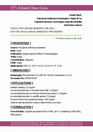 | PAA071Rb01 | Polyclonal Antibody to Interleukin 1 Alpha (IL1a) | WB; IHC; ICC; IP. |