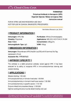 | PAB986Ra01 | Polyclonal Antibody to Hemopexin (HPX) | WB; IHC |