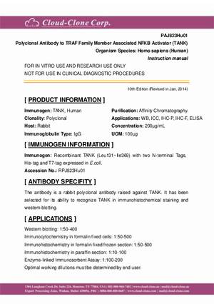 | PAJ823Hu01 | Polyclonal Antibody to TRAF Family Member Associated NFKB Activator (TANK) | WB; IHC |