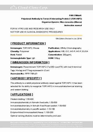 | PAR170Mu01 | Polyclonal Antibody to Torsin A Interacting Protein 2 (TOR1AIP2) | IHC |