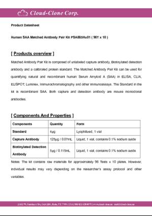 Recombinant Serum Amyloid A (SAA) 10ug Standard Monoclonal Antibody to Serum Amyloid A (SAA) 100ug Capture Ab Biotin-Linked Monoclonal Antibody to Serum Amyloid A (SAA) 10ug Detection Ab - ApplicationsELISA; CLIA; ELISPOT; Luminex; Immunochromatography and other Immunoassays.
