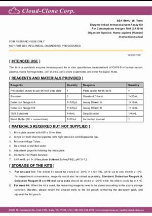| SEA156Hu | ELISA Kit for Carbohydrate Antigen 19-9 (CA19-9) | Enzyme-linked immunosorbent assay for Antigen Detection. |