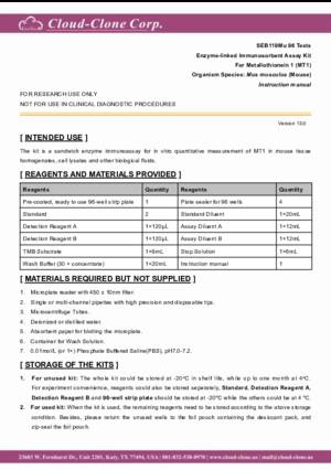| SEB119Mu | ELISA Kit for Metallothionein 1 (MT1) | Enzyme-linked immunosorbent assay for Antigen Detection. |