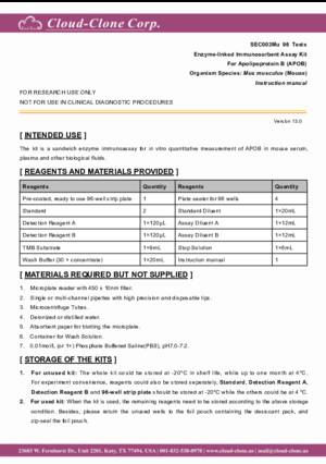 | SEC003Mu | ELISA Kit for Apolipoprotein B (APOB) | Enzyme-linked immunosorbent assay for Antigen Detection. |