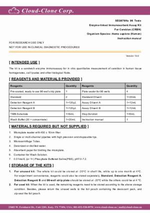 | SEG676Hu | ELISA Kit for Cereblon (CRBN) | Enzyme-linked immunosorbent assay for Antigen Detection. |