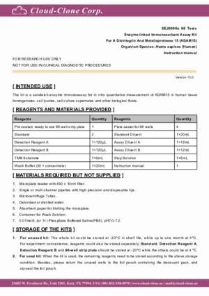 | SEJ800Hu | ELISA Kit for A Disintegrin And Metalloprotease 15 (ADAM15) | Enzyme-linked immunosorbent assay for Antigen Detection. |