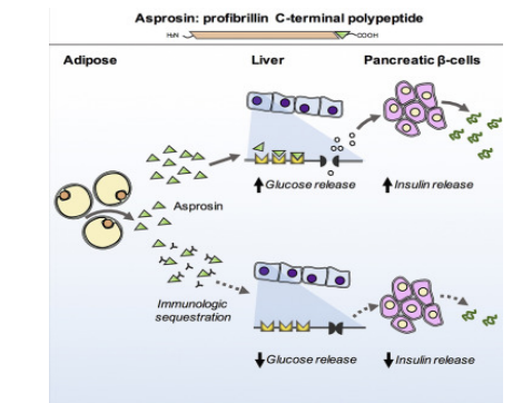 Obesity/diabetic people with high plasma glucose and insulin levels have asprosin in abundance. Chopra’ s team also found that obese people have twice as much asprosin in their blood than people who are not obese. It’s likely that as fat levels go up, asprosin goes up, too. The researchers thought when antibodies target asprosin, the hepatic glucose released into the blood stream will be reduced, a small amount of insulin released by pancreas cells will be improved.