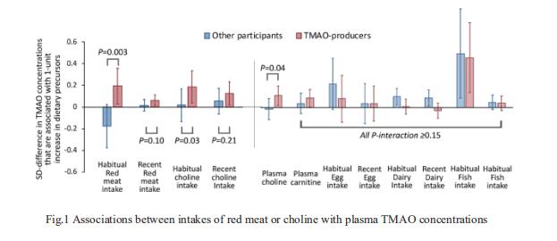 Gut-produced trimethylamine N-oxide (TMAO) is postulated as a possible link between red meat intake and poor cardiometabolic health. Qi Sun, Department of Nutrition, Harvard University TH Chan School of Public Health, and his team investigated whether gut microbiome could modify associations of dietary precursors with TMAO concentrations and cardiometabolic risk markers among free-living individuals[1]. Multivariable taxa-wide association analysis identified 10 bacterial species whose abundance was significantly associated with plasma TMAO concentrations. Higher habitual intake of red meat and choline was significantly associated with higher TMAO concentrations among participants who were microbial TMAO-producers(Fig.1). Among abundant TMAO-predicting species, Alistipes shahii significantly strengthened the positive association between red meat intake and HbA1c levels(Fig.2). They showed that a gut microbial TMAO-producer phenotype, as characterised by the identified species, modified the associations between habitual intakes of red meat/choline and plasma TMAO concentrations. In addition, specific species might also interact with red meat intake in associations with cardiometabolic risk factors. Identifying functional gut microbiome responses to dietary interventions has the potential to facilitate the development of individualised strategies for more efficient prevention of cardiometabolic diseases.