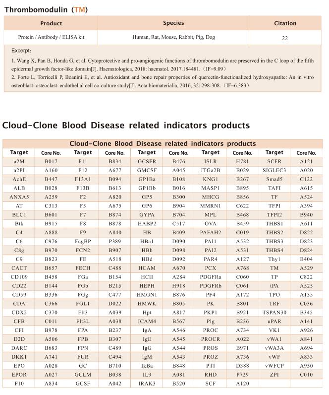 The kits [ELISA Kit for Transferrin (TF), SEC036Hu/CEC036Mu; ELISA Kit for Prothrombin Fragment 1+2 (F1+2), SEA710Hu/SEA710Mu; ELISA Kit for Coagulation Factor XII (F12), SEA677Hu/SEA677Mu] of Cloud-Clone brand was chosed in this article, we are so proud for supporting the reaserchers.