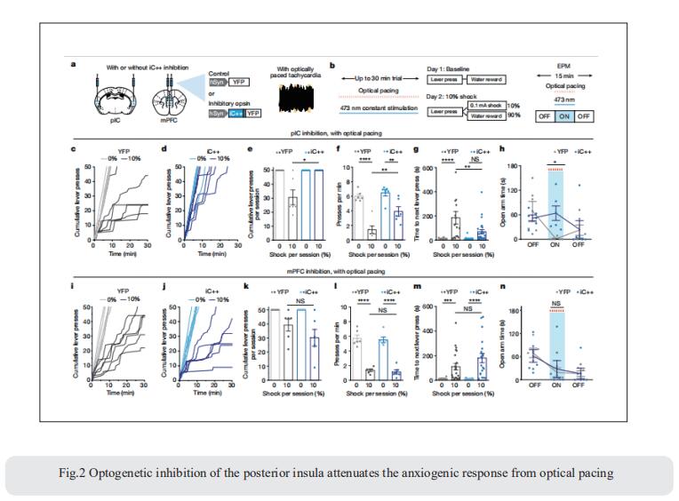 Emotional states influence bodily physiology, as exemplified in the top-down process by which anxiety causes faster beating of the heart. However, whether an increased heart rate might itself induce anxiety or fear responses is unclear. Karl Deisseroth, Department of Bioengineering, Stanford University, USA, and his team developed a noninvasive optogenetic pacemaker for precise, cell-type-specific control of cardiac rhythms of up to 900beats per minute in freely moving mice, enabled by a wearable micro-LED harness and the systemic viral delivery of a potent pump-like channelrhodopsin[2]. They found that optically evoked tachycardia potently enhanced anxiety-like behaviour, but crucially only in risky contexts, indicating that both central (brain) and peripheral (body) processes may be involved in the development of emotional states. To identify potential mechanisms, they used whole-brain activity screening and electrophysiology to find brain regions that were activated by imposed cardiac rhythms. They identified the posterior insular cortex as a potential mediator of bottom-up cardiac interoceptive processing, and found that optogenetic inhibition of this brain region attenuated the anxiety-like behaviour that was induced by optical cardiac pacing (Fig.2). Together, these findings reveal that cells of both the body and the brain must be considered together to understand the origins of emotional or affective states.