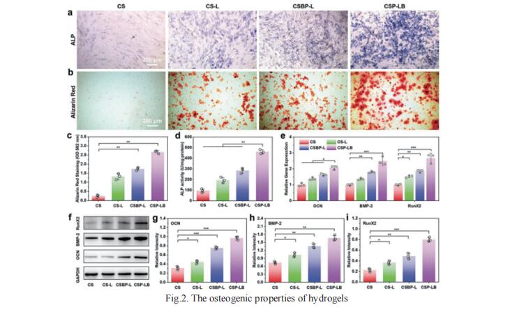 Although growth factor (GF)-loaded hydrogels have been explored as promising materials in repairing bone defects, it still remains challenging to construct smart hydrogels with excellent gelation/mechanical properties as well as controllable GF releasing capability. Xisheng Weng, Department of Orthopedic Surgery, Peking Union Medical College Hospital, Chinese Academy of Medical Science and Peking Union Medical College, China, and his team constructed a smart injectable thermo-responsive hydrogel (denoted as CSP-LB) by incorporating bone morphogenetic protein 2 (BMP-2) functionalized MgFe layered double hydroxide (LDH) nanosheets into chitosan/silk fibroin (CS) hydrogel loaded with platelet-derived growth factor BB (PDGF-BB), which can achieve a burst release of PDGF-BB and a sustained release of BMP-2, for highly efficient bone regeneration is reported[2]. The incorporation of MgFe-LDH in CS hydrogel not only shortens the gelation time and decreases sol–gel transition temperature, but also enhances the mechanical property of the hydrogel. Because of the sequential release of dual-GFs and sustained release of bioactive Mg2+/Fe3+ ions, the in vitro experiments prove that the CSP-LB hydrogel exhibits excellent angiogenic and osteogenic properties compared with the CS hydrogel (Fig.2). In vivo experiments further prove that the CSP-LB hydrogel can significantly enhance bone regeneration with higher bone volume and mineral density than that of the CS hydrogel. This smart thermo-sensitive CSP-LB hydrogel possesses excellent gelation capability and angiogenic and osteogenic properties, thus providing a promising minimally invasive solution for bone defect treatment.