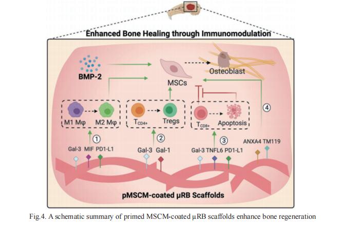 Naturally-derived cell membranes have shown great promise in functionalizing nanoparticles to enhance biointerfacing functions for drug delivery applications. However, its potential for functionalizing macroporous scaffolds to enhance tissue regeneration in vivo remains unexplored. Fan Yang, Department of Orthopaedic Surgery, Stanford University School of Medicine, USA, and his team reported mensenchymal stem cell membrane (MSCM)-coated microribbon (µRB) scaffolds for treating critical size cranial bone defects via targeting immunomodulation[4]. It is demonstrated that MSCM coating promotes macrophage (Mϕ) polarization toward regenerative phenotype, induces CD8+ T cell apoptosis, and enhances regulatory T cell differentiation in vitro and in vivo. When combined with a low dosage of BMP-2, MSCM coating further accelerates bone regeneration and suppresses inflammation (Fig.4). These results establish cell membrane-coated microribbon scaffolds as a promising strategy for treating critical size bone defects via immunomodulation.