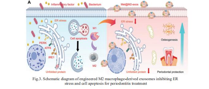 As an essential component of the host immunity, macrophages are highly plastic and play a crucial role in inflammatory response. As M2 macrophage-derived exosomes (M2-exos) can actively target inflammatory sites and modulate immune microenvironments, M2-exos can effectively treat periodontitis. Lixia Mao, Department of Oral and Cranio-Maxillofacial Surgery, Shanghai Ninth People's Hospital, China, and his team fabricated engineered M2-exos loading with melatonin (Mel@M2-exos) for treating periodontitis[3]. As a result, M2-exos drive an appropriate and timely macrophage reprogramming from M1 to M2 type, which resolves chronic inflammation and accelerated periodontal healing. Melatonin released from Mel@M2-exos rescues the osteogenic and cementogenic differentiation capacity in inflammatory human periodontal ligament cells (hPDLCs) by reducing excessive ER stress and unfolded protein response (Fig.3). Injectable gelatin methacryloyl (GelMA) hydrogels with sustained-release Mel@M2-exos accelerate periodontal bone regeneration in rats with ligation-induced periodontitis. Taken together, melatonin engineering M2 macrophage-derived exosomes are promising candidates for inflammatory periodontal tissue regeneration.
