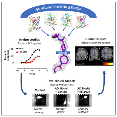 Based on its high expression in areas such as the hippocampus and cortex and the pro-cognitive effects in pre-clinical animal studies, the M1 muscarinic acetylcholine receptor (M1-receptor) is widely considered to be a key or mediator of cognitive function and thereby a target for the treatment in AD. Andrew B. Tobin of University of Glasgow and his team aimed to design the drug properties needed for a well-tolerated M1-agonist with the potential to alleviate cognitive loss by taking a stepwise translational approach from atomic structure, cell/tissue-based assays, evaluation in preclinical species, clinical safety testing, and finally establishing activity in memory centers in humans(Fig.2)[2]. Through this approach, they rationally designed the optimal properties, including selectivity and partial agonism, into HTL9936—a potential candidate for the treatment of memory loss in AD.