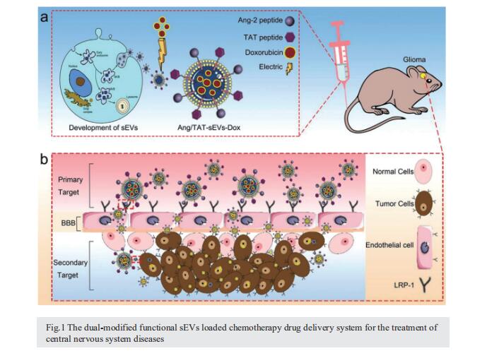 Glioma is one of the primary malignant brain tumours in adults, with a poor prognosis. Pharmacological reagents targeting glioma are limited to achieve the desired therapeutic effect due to the presence of blood-brain barrier (BBB). Effectively crossing the BBB and specifically targeting to the brain tumour are the major challenge for the glioma treatments. Here, we demonstrate that the well-defined small extracellular vesicles (sEVs) with dual-targeting drug delivery and cell-penetrating functions, modified by Angiopep-2 and trans-activator of transcription peptides, enable efficient and specific chemotherapy for glioma. The high efficiency of engineered sEVs in targeting BBB and glioma was assessed in both monolayer culture cells and BBB model in vitro, respectively. The observed high targeting efficiency was re-validated in subcutaneous tumour and orthotopic glioma mice models. After loading the doxorubicin into dual-modified functional sEVs, this specific dual-targeting delivery system could cross the BBB, reach the glioma, and penetrate the tumour. Such a mode of drug delivery significantly improved more than 2-fold survival time of glioma mice with very few side effects. In conclusion, utilization of the dualmodified sEVs represents a unique and efficient strategy for drug delivery, holding great promise for the treatments of central nervous system diseases.