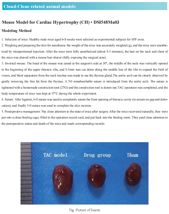 Cloud-Clone can not only provide a variety of cardiovascular system disease models, including myocardial hypertrophy, myocardial infarction, arrhythmia, myocarditis, heart failure, etc., covering common cardiovascular system diseases; It also has various kinds of cardiovascular system signal pathway common indicators related products, which can help the majority of researchers to study cardiovascular system diseases.