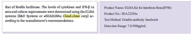 The kits [ELISA Kit for Interferon Beta (IFNb), SEA222Mu] of Cloud-Clone brand were chosed in this article, we are so proud for supporting the reaserchers.